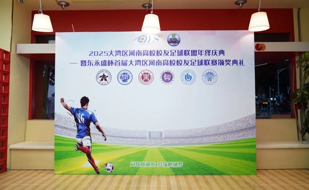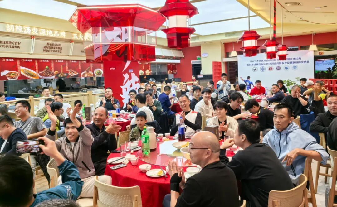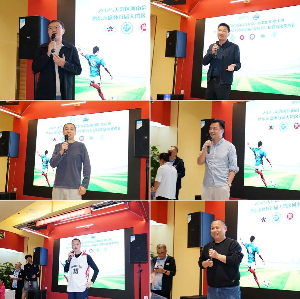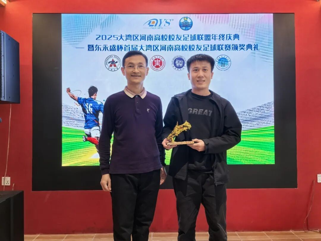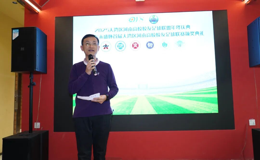 比赛最后一轮结束当晚,六支球队及特邀嘉宾齐聚西丽逍遥渡豫家宴·中原菜,参加2025大湾区河南高校校友足球联盟年终庆典暨东永盛杯GHL联赛颁奖典礼。河大深圳研究院副院长、校友会副会长周大鹏应邀参加颁奖典礼并为获奖足球队和最佳射手颁奖!