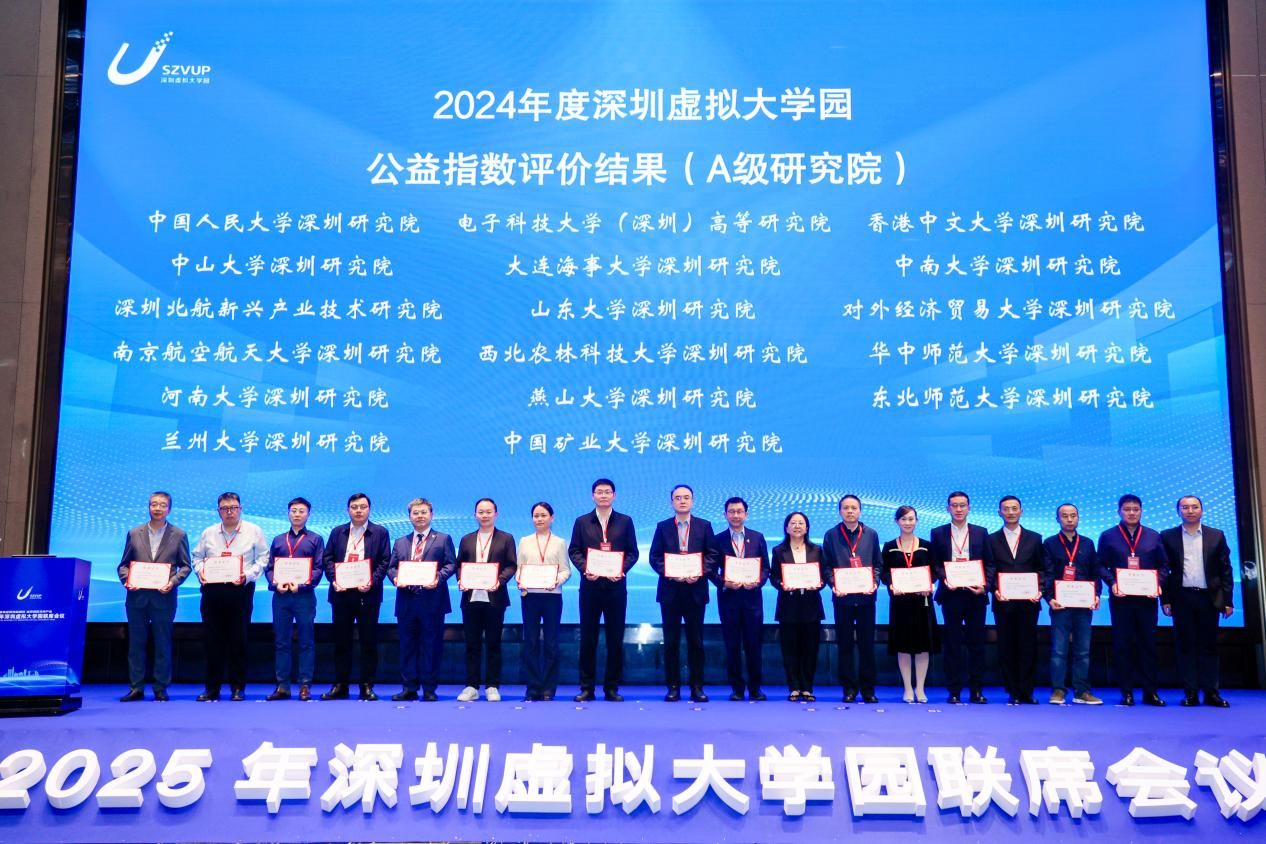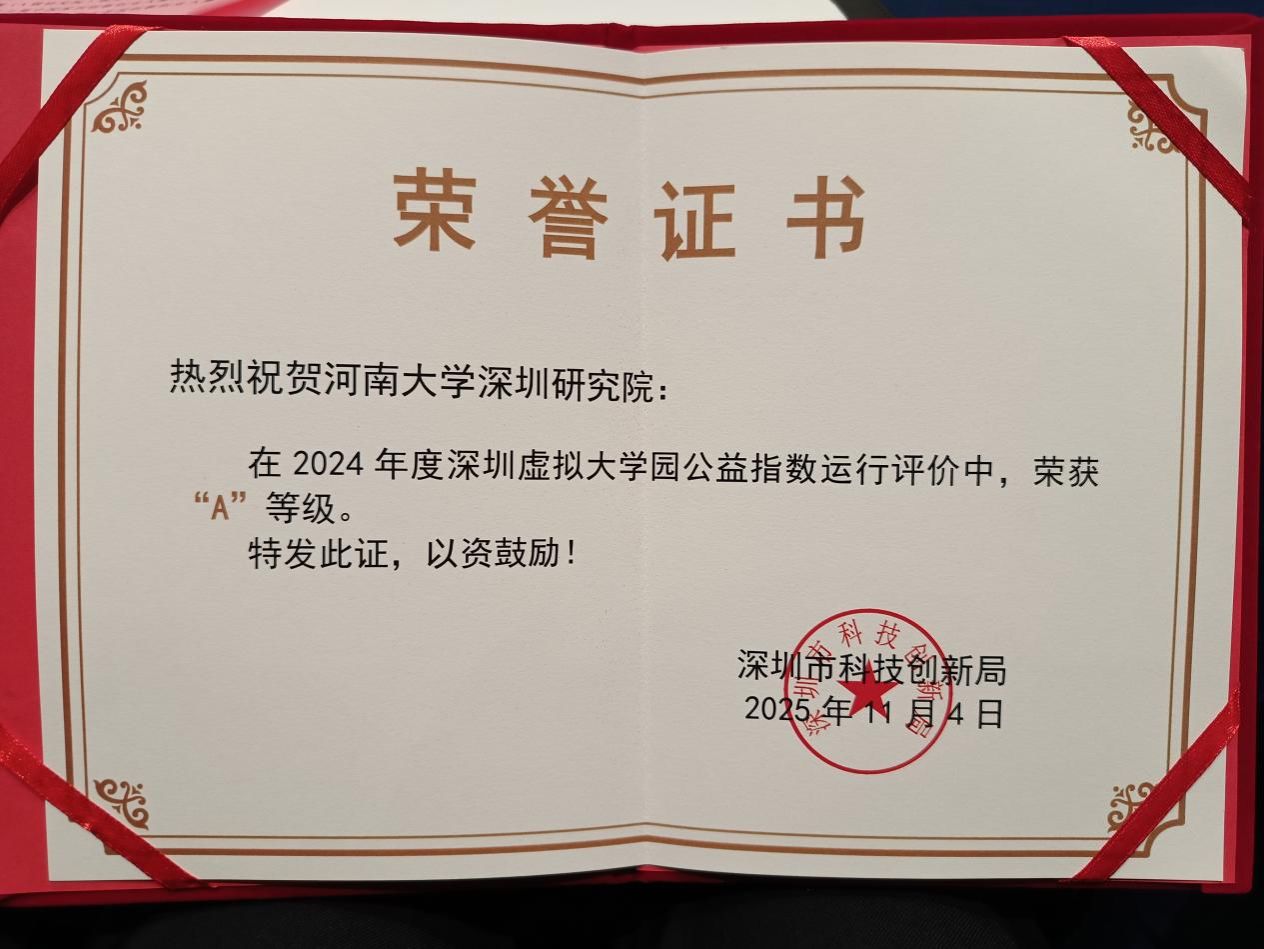 会议期间,深圳市科技创新局对在2024年度深圳虚拟大学园成员院校深圳研究院公益指数运行评价中获评“A”等级的研究院予以表彰,河南大学深圳研究院获评“A”级,首次进入第一梯队,周大鹏教授代表研究院上台领奖。该评价工作由中共深圳市委机构编制委员会办公室联合深圳市科技创新局组织实施,全面考量深圳虚拟大学园各成员院校深圳研究院在科学管理、公共服务和运行效益等方面的综合表现。经两轮专家评审及复核,最终确定A级名单。同时,我院牛利民、周大鹏两位老师获得深圳虚拟大学园“新锐奖”。