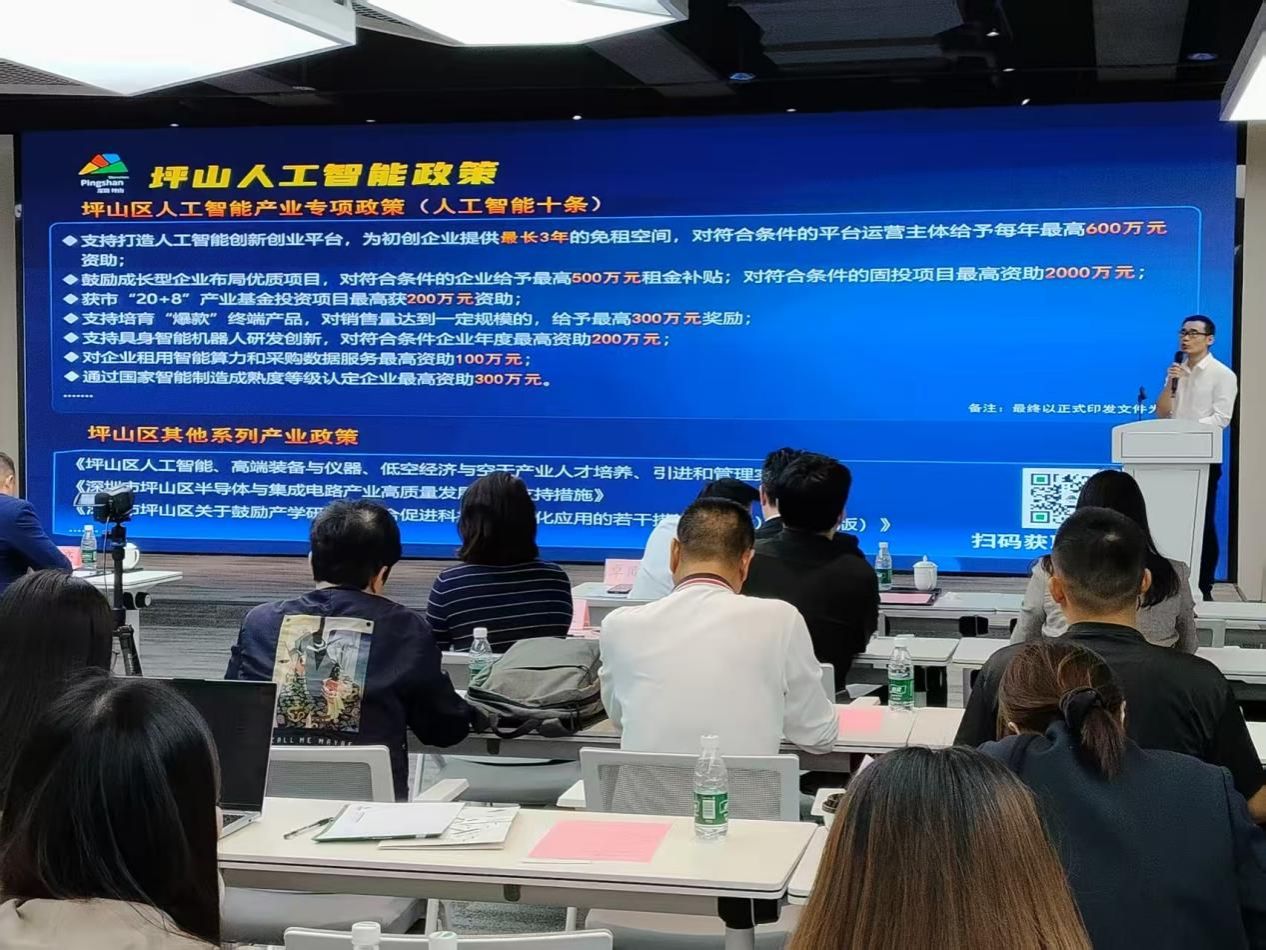 区工业和信息化局在会上推介坪山区人工智能产业专项政策(目前正在征求意见),支持打造人工智能创新创业平台,为初创企业提供最长3年的免租空间;鼓励成长性企业布局优质项目,对符合条件的企业给予最高500万元的租金补贴;鼓励20+8产业基金投资项目最高或200万元资助;支持培育“爆款”终端产品;支持具身智能机器人研发创新;对租用智能算力和采购数据服务的企业进行资助;对通过国家智能制造成熟度等级认定的企业给予补助等十条政策,也称“人工智能十条”。
